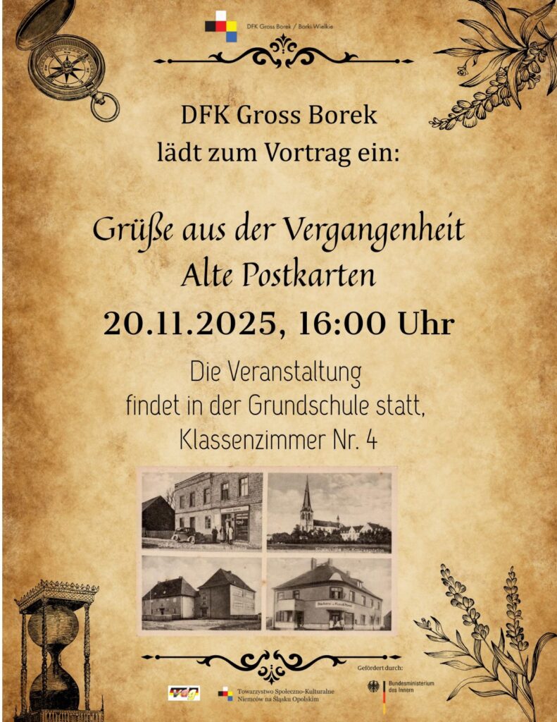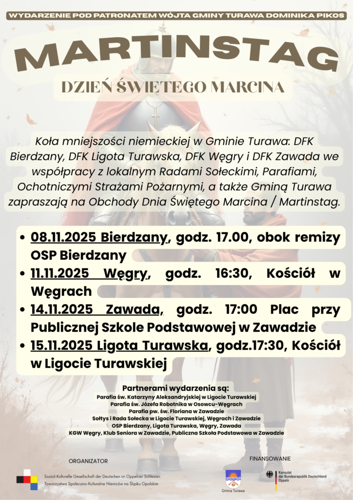 Koła mniejszości niemieckiej w Gminie Turawa: DFK Bierdzany, DFK Ligota Turawska, DFK Węgry i DFK Zawada we współpracy z lokalnym Radami Sołeckimi, Parafiami, Ochotniczymi Strażami Pożarnymi, a także Gminą Turawa zapraszają na Obchody Dnia Świętego Marcina / Martinstag. – 08.11.2025 Bierdzany, godz. 17.00, obok remizy OSP Bierdzany – 11.11.2025 Węgry, godz. 16:30, Kościół w Węgrach – 14.11.2025 Zawada, godz. 17:00 […]