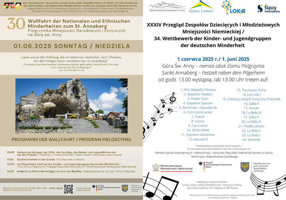 - 11:00 Eucharistiefeier im Anliegen der Sozial-Kulturellen Gesellschaft der Deutschen im Oppelner Schlesien und DFK der Woiwodschaft Schlesien anlässlich ihres 35-jährigen Bestehens wie auch für die Deutschen, das Volk Roma und andere nationale und regionale Minderheiten in Polen