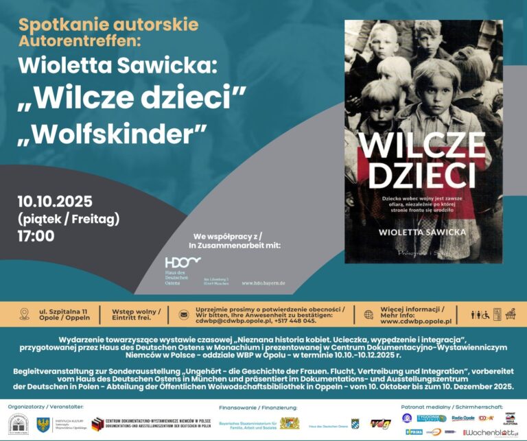 Piątek, 10 października 2025, 17:00: Spotkanie autorskie: Wioletta Sawicka „Wilcze dzieci” – prezentacja zbioru historii cywilów, wówczas często kilkuletnich dzieci, z Prus Wschodnich – pierwszego terytorium Rzeszy, do którego w 1945 r. dotarli sowieccy żołnierze. Spotkanie rozpoczyna cykl wydarzeń towarzyszących wystawie „Nieznana historia kobiet. Ucieczka, wypędzenie i integracja”.