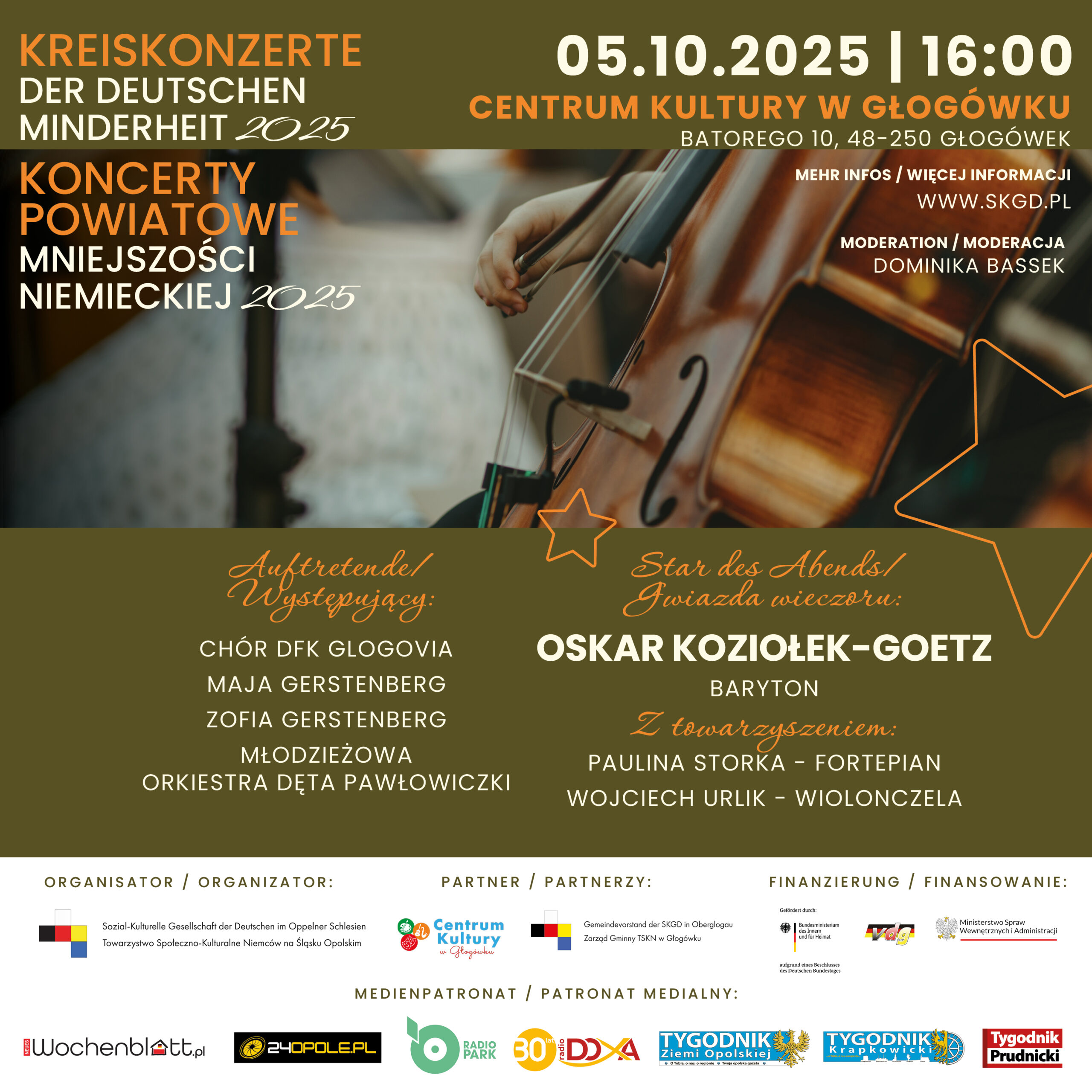 Am Sonntag, den 5. Oktober um 16:00 Uhr im Kulturzentrum (ul. Batorego 10) in Oberglogau findet das letzte Konzert in diesem Jahr statt – aus der Reihe der Kreiskonzerte der deutschen Minderheit 2025.
