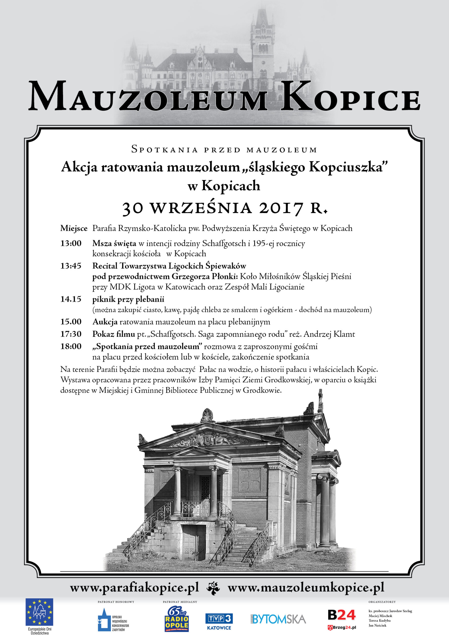 30 września organizujemy drugie spotkanie w znacznie poszerzonym już gronie ratujących ten znakomity zabytek.Szczegółowy program znajduje się na stronie: mauzoleumkopice.pl i parafiakopice.pl. Rozpoczynamy o godz. 13.00 mszą św. i recitalem zespołu pod dyrekcją Grzegorza Płonki. Wydarzeniem szczególnym w tym dniu jest pokaz filmu „Schaffgotsch. Saga zapomnianego rodu” w reż Andrzeja Klamta, z osobistym udziałem autora.