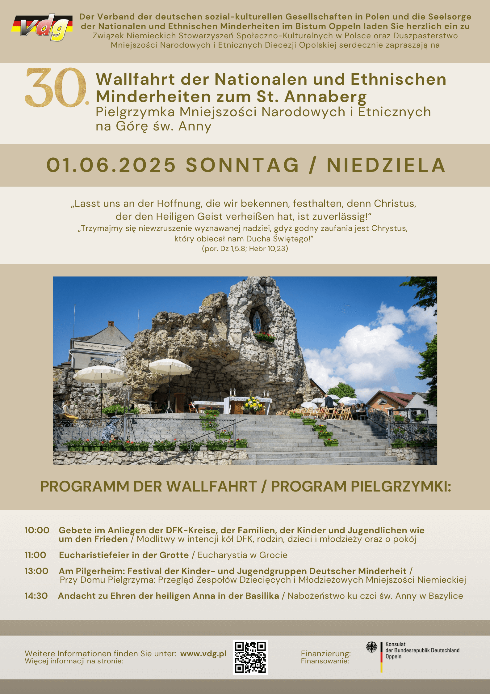Die Wallfahrten sind ein fester Bestandteil des gesellschaftlichen Lebens der Deutschen Minderheit, was durch ihre lange Tradition und das ungebrochene und große Interesse der Pilger belegt wird. In diesem Jahr werden wir die Ehre haben, zum dreißigsten Mal an der Wallfahrt der Nationalen und Ethnischen Minderheiten zum St. Annaberg teilzunehmen. Sie findet am 1. Juni 2025 statt und steht unter dem Motto „Lasst uns an der Hoffnung, die wir bekennen, festhalten, denn Christus, der den Heiligen Geist verheißen hat, ist zuverlässig!“ (vgl. Apg 1,5.8; Hebr 10,23). Während der Wallfahrt werden wir auch für die Sozial-kulturelle Gesellschaft der Deutschen in Oppelner Schlesien und seine Mitglieder anlässlich des 35-jährigen Bestehens der Organisation beten.