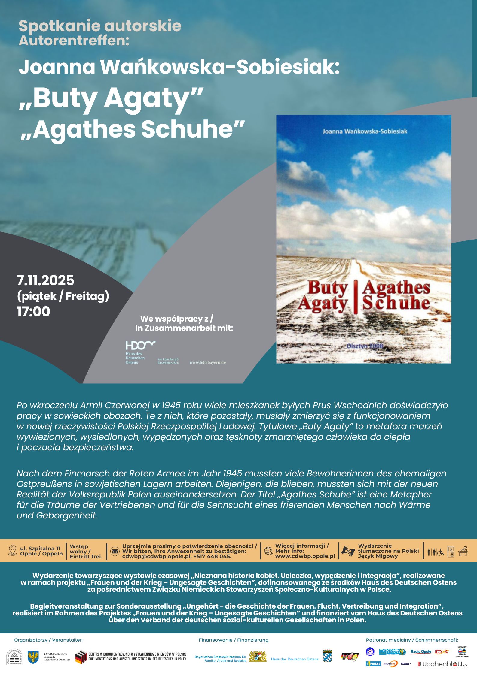 - Autorentreffen mit Joanna Wańkowska-Sobiesiak, Autorin der Reportagesammlung „Agathes Schuhe“: am 7. November 2025 um 17:00 Uhr in unserem Sitz in der ul. Szpitalna 11;