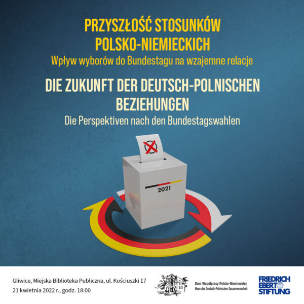 Das Haus der Deutsch-Polnischen Zusammenarbeit und die Friedrich-Ebert-Stiftung in Polen laden am 21. April um 18:00 Uhr in die Stadtbibliothek in Gliwice zum Treffen über die deutsch polnischen Beziehungen ein. Diskussionstreffen „Die Zukunft der deutsch-polnischen Beziehungen. Die Perspektiven nach den Bundestagswahlen“ 21. April 2022, 18:00 Uhr Stadtbibliothek in Gliwice, Kościuszki 17 ein.