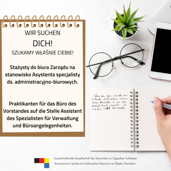 Die Sozial-Kulturelle Gesellschaft der Deutschen in Oppelner Schlesien, die größte Nichtregierungsorganisation in der Region, sucht einen Praktikanten für das Büro des Vorstandes auf die Stelle Assistent des Spezialisten für Verwaltung und Büroangelegenheiten.